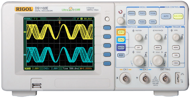 RIGOL DS1102E Digital Oscilloscope features 2 input channels, up to 1 GS/s real time sample rate, up to 100 MHz bandwidth, and much more to simplify your system design and test.The DS1102E Digital Oscilloscope provides exceptional waveform viewing and measurements in a compact, lightweight package, ideal for production test, field service, research, design, and education and training applications involving analog/digital circuits test and troubleshooting.